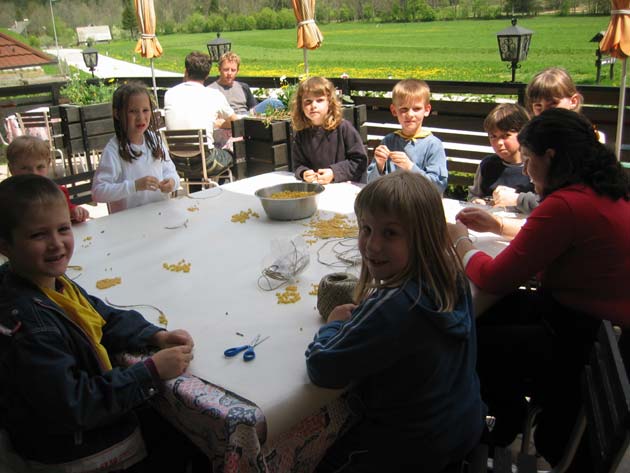 V eni skupini smo izdelovali ogrlice iz testenin, ki smo jih tudi pobarvali.