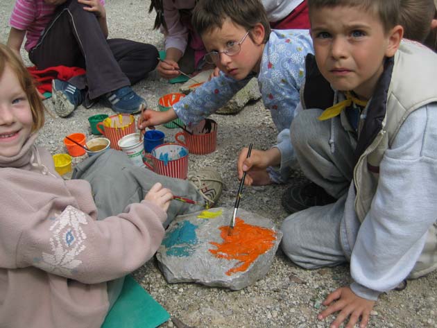 V drugi skupini smo s temperami in prstnimi barvami barvali kamenje.